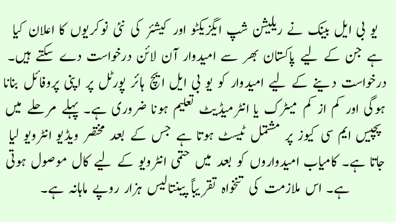 United Bank Limited hires new candidates through its digital hiring system. These roles help beginners learn real branch work.