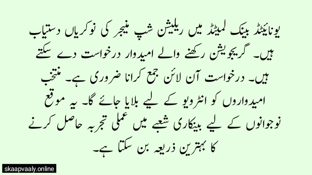 UBL Bank Relationship Manager Jobs 2026 provide a starting point in the banking sector. The role exposes graduates to real customer interaction.